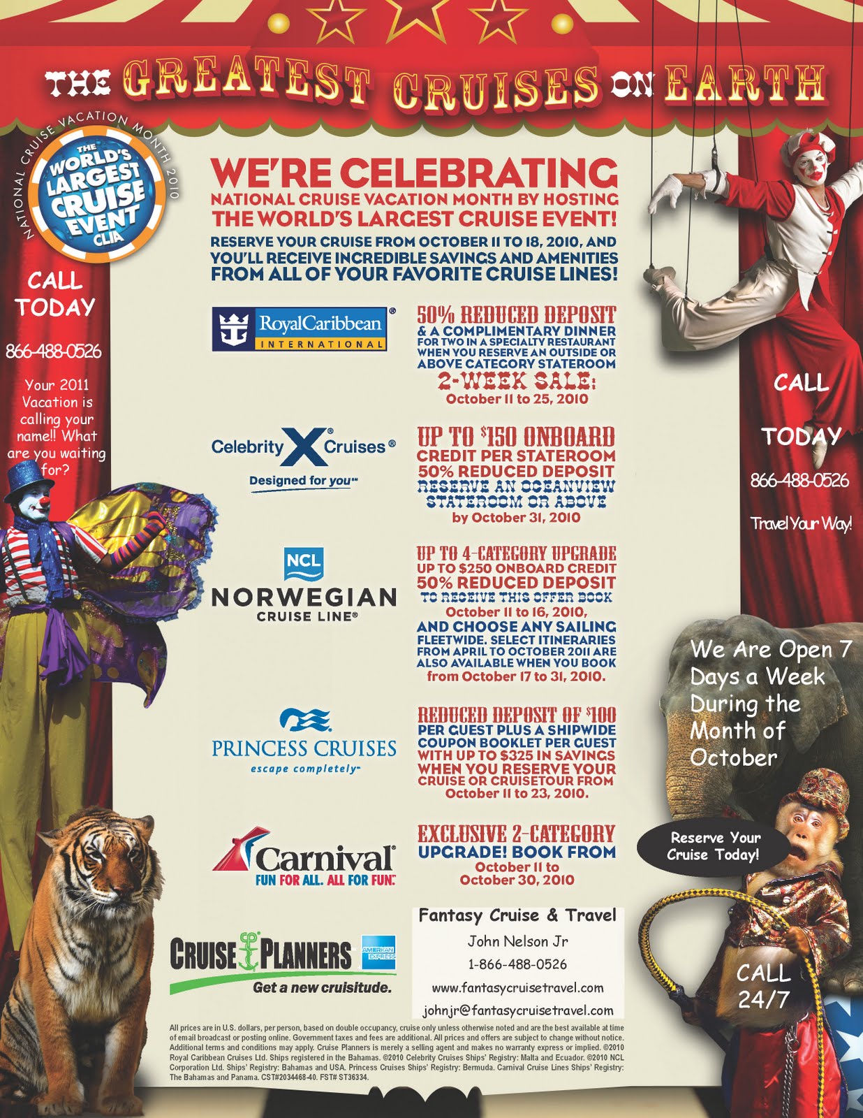 Come One! Come All! Join the Celebration of National Cruise Vacation Month! The Celebration is in full swing! This year,Fantasy Cruise & Travel - Cruise Planners has put together the Greatest Cruises on Earth in order to bring to you exciting specials on the best cruise lines around. We’ve got reduced deposits and onboard coupon booklets to category upgrades, complimentary dinners, shipboard credits and more! And it’s all happening from October 11 to 18, 2010, so don’t miss out. Make sure and invite your friends. If you refer someone to me and they book during theWorld's Largest Cruise Event you will receive a very cool gift card.
